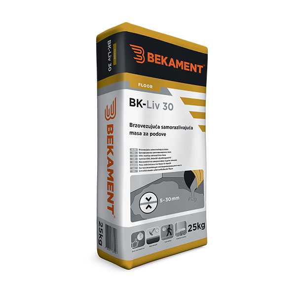Podloga na koju se masa nanosi mora biti čvrsta, čista, otprašena, bez masnoća i slabo vezanih delova. Pre nanošenja BK-Liv 30 podlogu premazati BK-Ultra Prime-om, dok u slučaju nanošenja na stare keramičke pločice kao podlogu koristiti BK-Bond. Vreme sušenja podloge iznosi min. 4h. Priprema mase se vrši dodavanjem praha u 19-20% vode (oko 5l vode za 25 kg praha), do potpune homogenizacije. Masu ostaviti da odstoji 5 min a zatim ponovo promešati. Masa se razliva na podlogu u jednom sloju koristeći pogodan alat a nakon razlivanja poželjno je površinu prevući specijalnim igličastim valjkom („jež“ valjak), u cilju izbacivanja mehurova vazduha. Samešanu masu upotrebiti u roku od 45 min. Za detaljna uputstva pogledati tehnički list proizvoda.